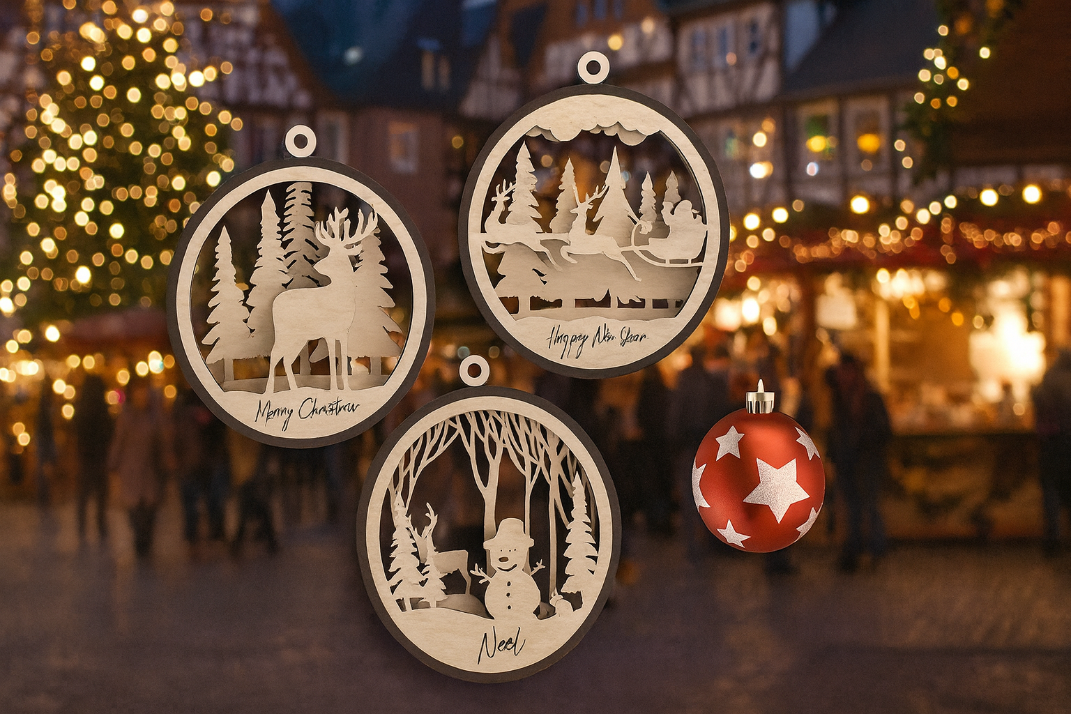 Celebrate the magic of the season with this beautifully crafted trio of wooden Christmas ornaments. Each ornament is delicately laser-cut, bringing cozy winter scenes to life with charming detail and timeless holiday spirit.